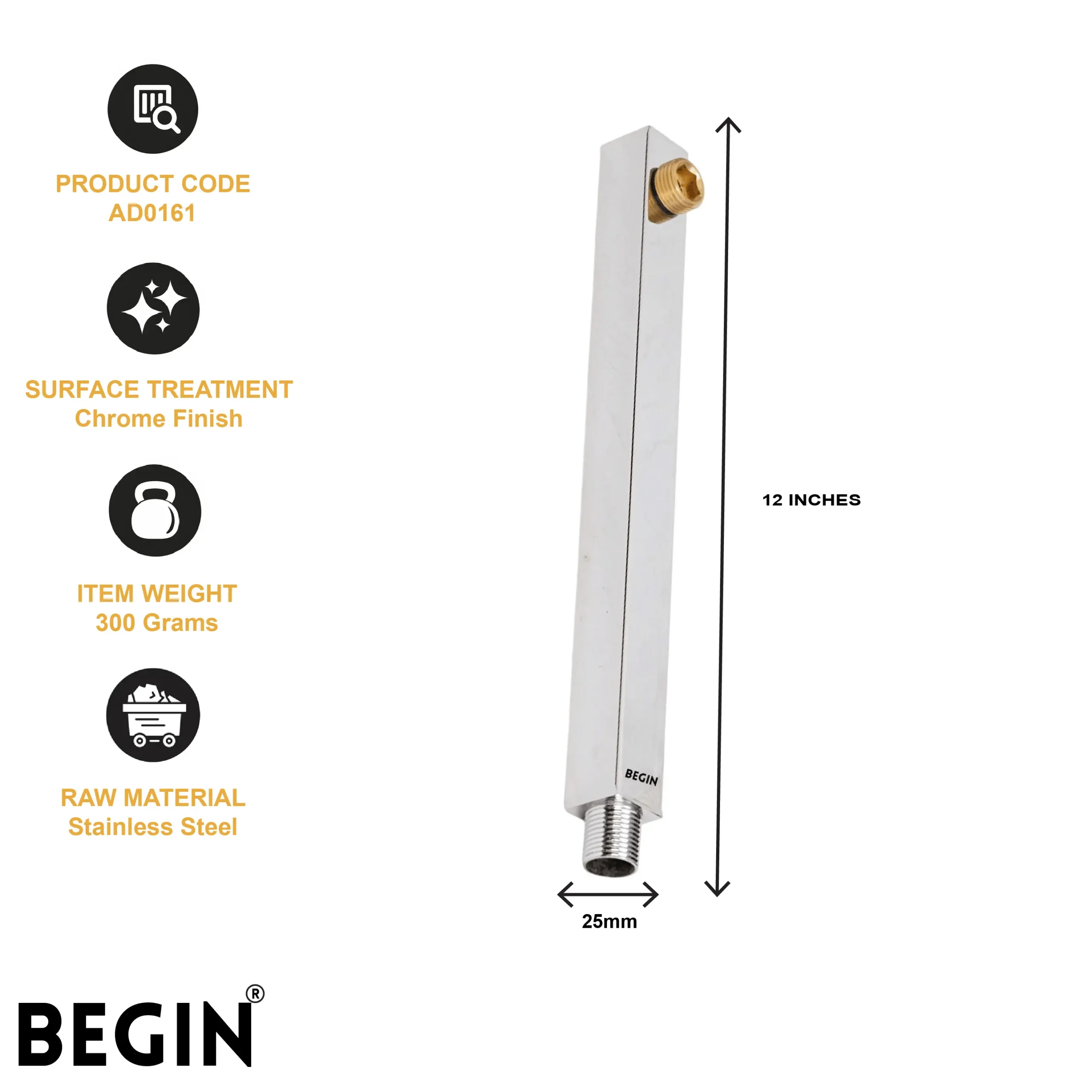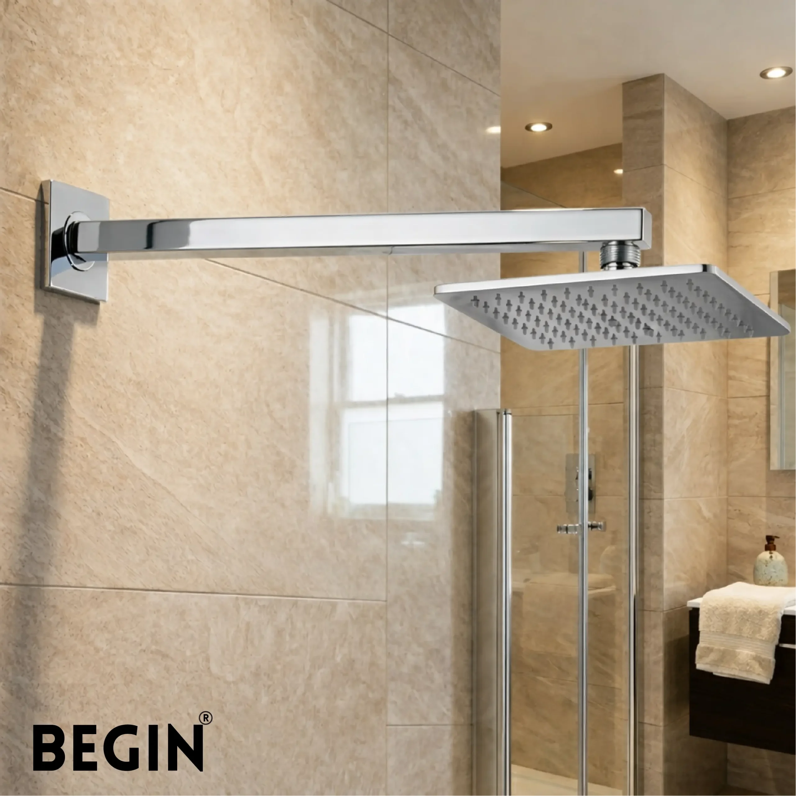 The BEGIN 12 Inch Square Shower Arm AD0161 is designed to provide stable support for overhead shower heads while enhancing the modern look of your bathroom. Its square profile adds a sleek and contemporary touch to stylish shower setups.