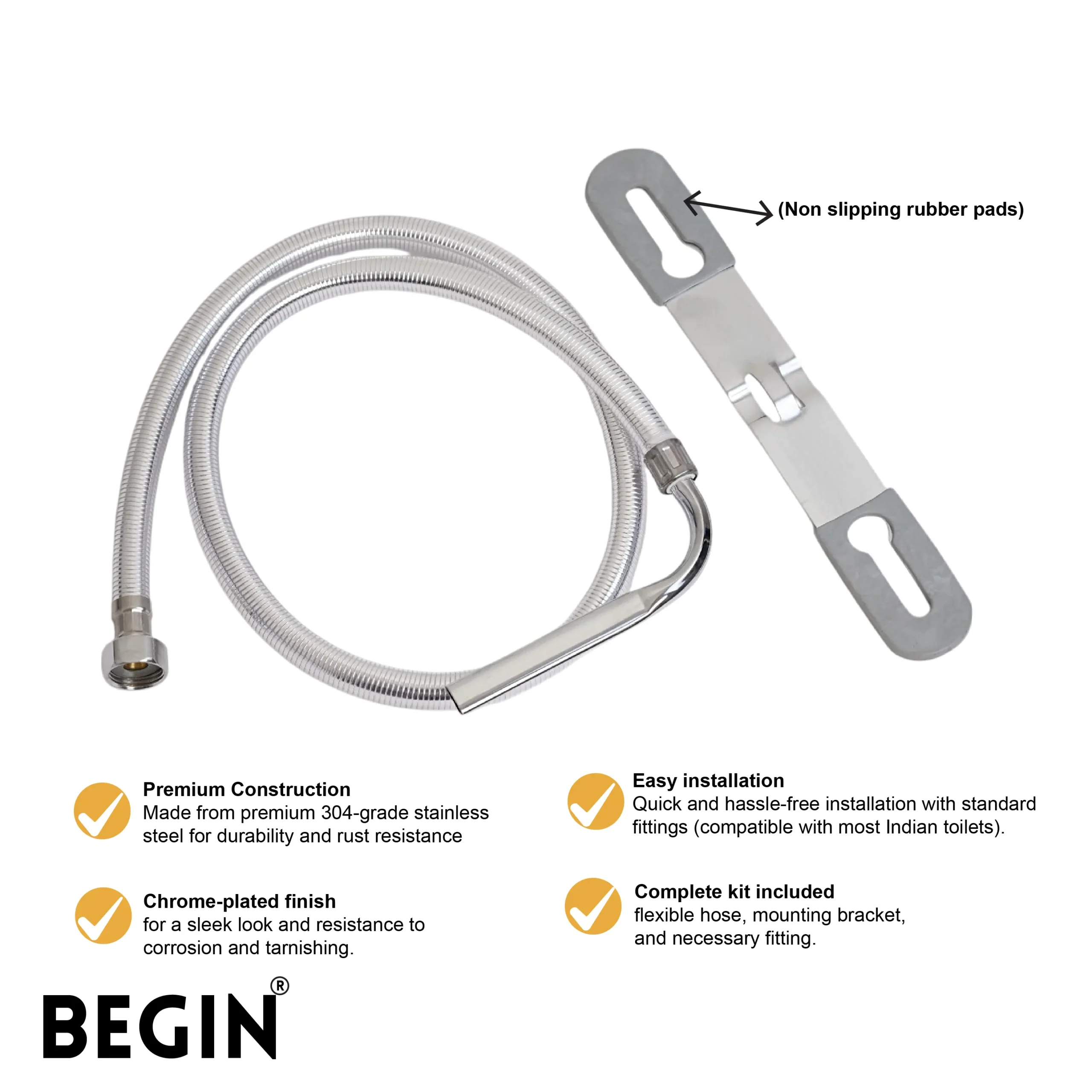 The BEGIN 1.5 Meter Multi Jet Hose with SS 304 Clamp AA0521 is designed for reliable water connections in bathrooms and kitchens. Its high-quality multi jet hose ensures smooth water flow and durability, making it ideal for everyday use.