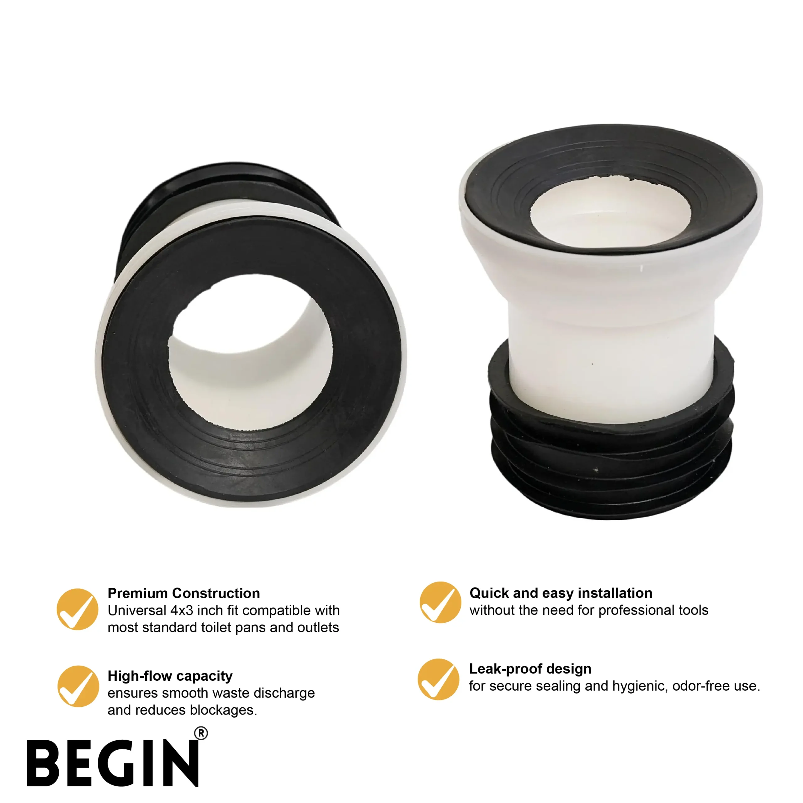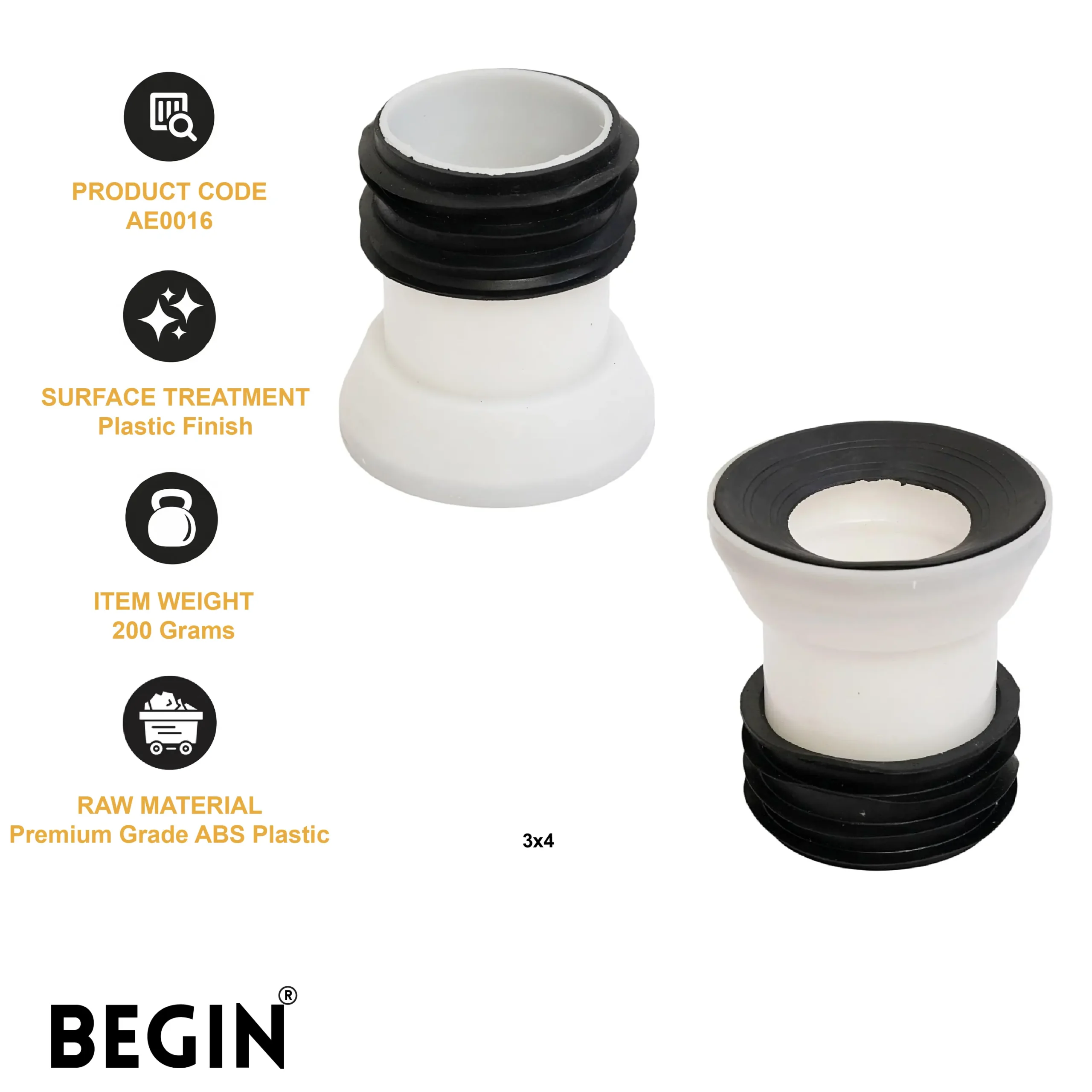 The BEGIN 3×4 Inch Pan Connector HV AE0016 is designed to provide a secure and reliable connection for toilet waste systems. Its precise construction ensures a leak-free fit, making it ideal for modern bathroom installations.