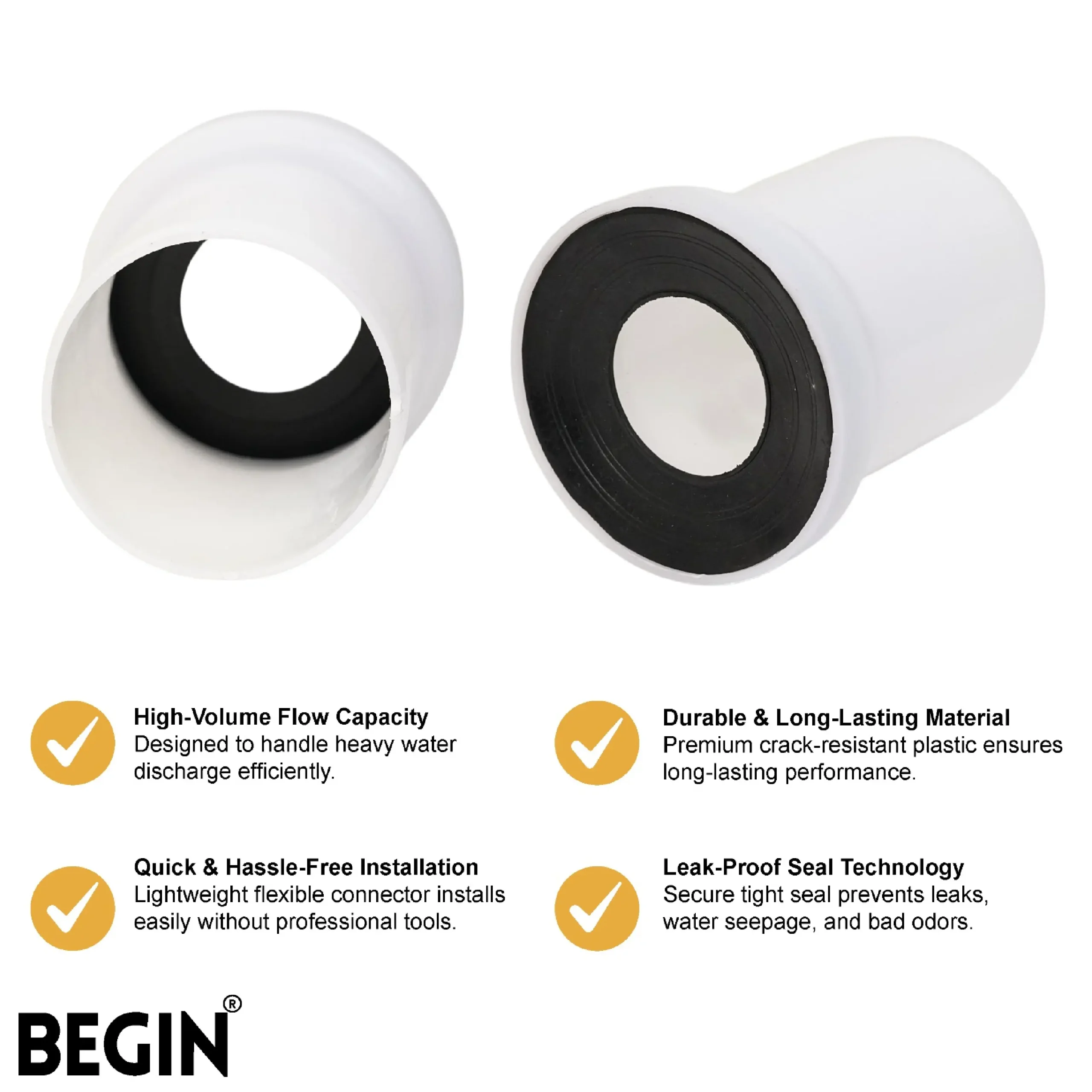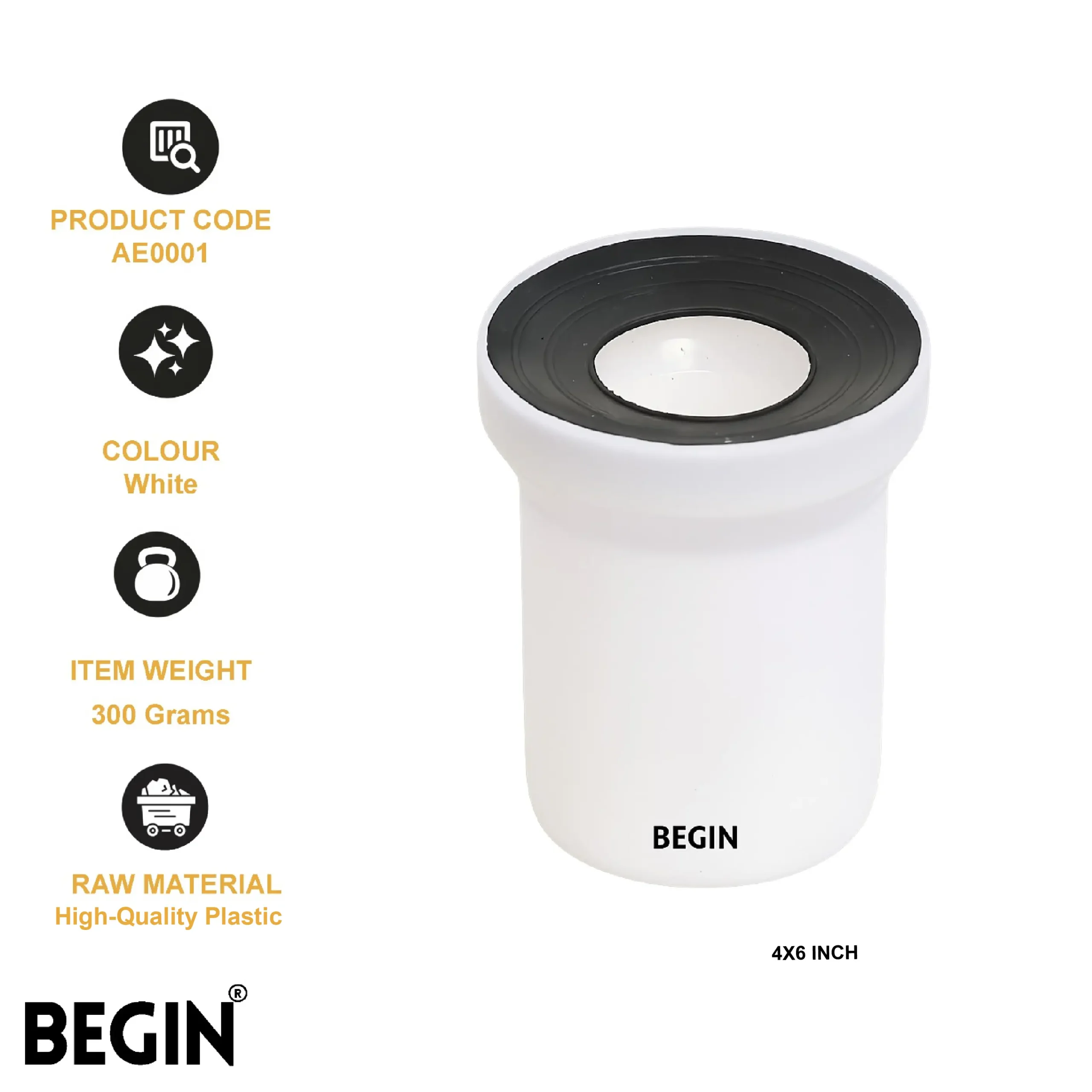 The BEGIN 4×6 Pan Connector HV AE0001 is designed to provide a reliable connection between the toilet pan and the waste outlet pipe. It ensures smooth water flow and helps maintain proper drainage in bathroom plumbing systems.