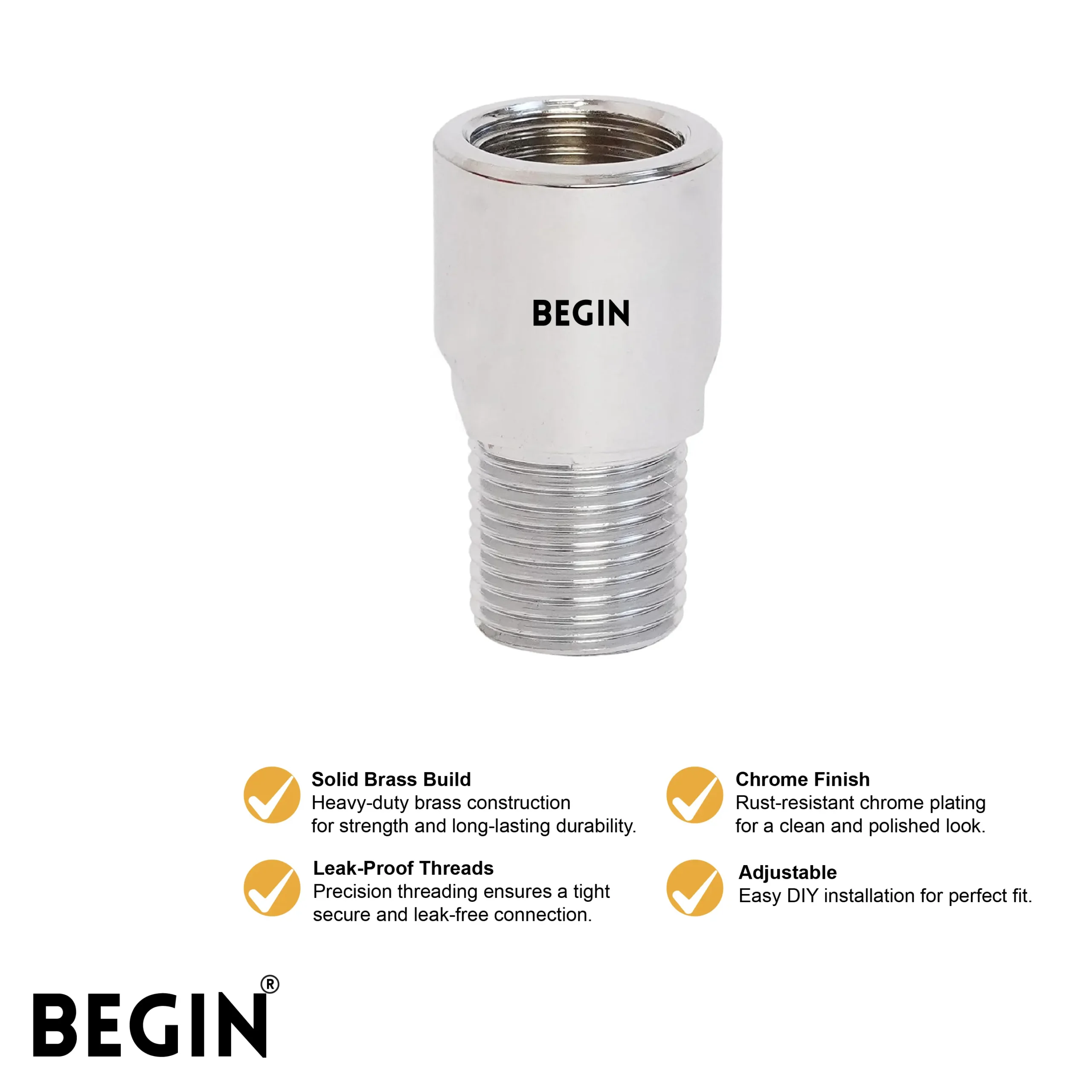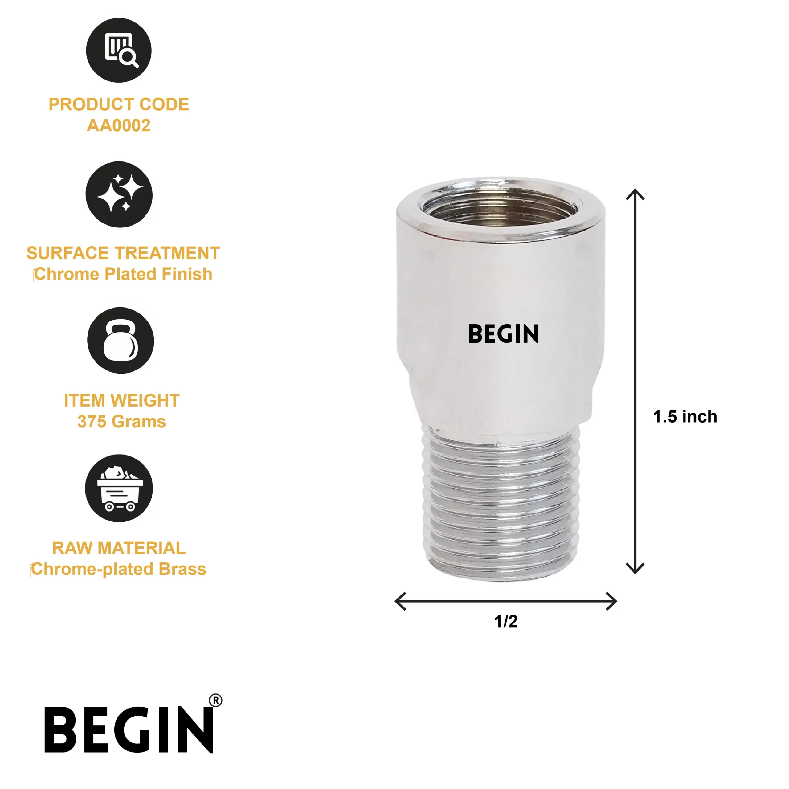 The BEGIN Brass Extension Nipple 1.5″ (35mm) AA0002 is designed to provide a secure and reliable connection for plumbing systems. Its precise threading ensures a leak-free fit, making it ideal for various water installations.