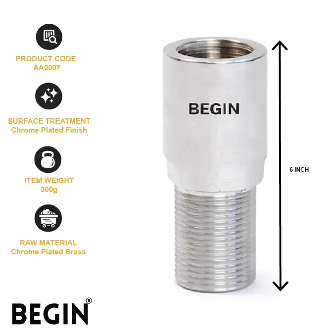 The BEGIN Brass Extension Nipple 6″ AA0007 is designed to provide a secure and reliable connection for plumbing systems. Its precision threading ensures a leak-free fit, making it ideal for various water installations.