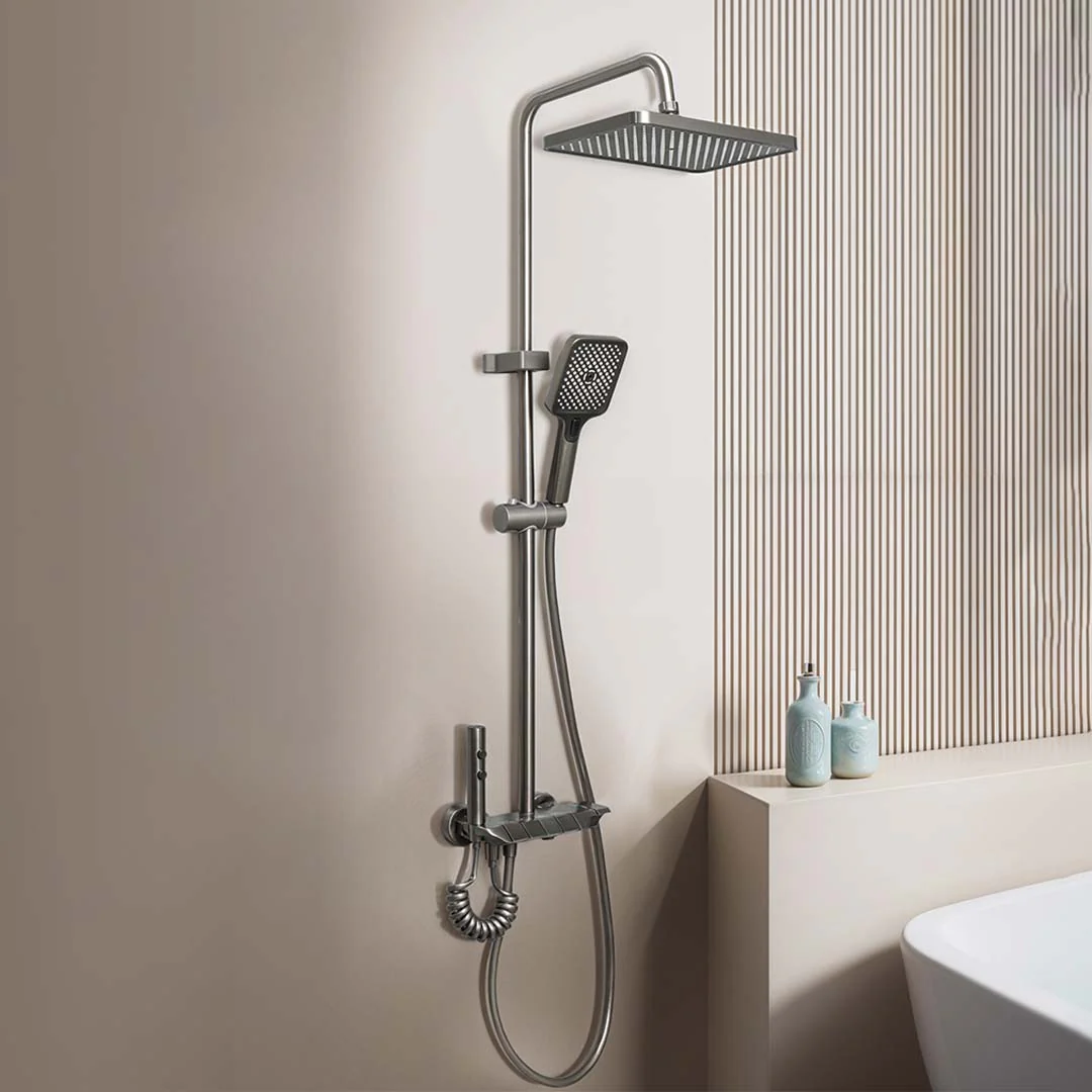 Made from solid brass ingot, this 4-in-1 Smart Shower Panel offers independent control of overhead shower, hand shower, spray gun, and tub spout.