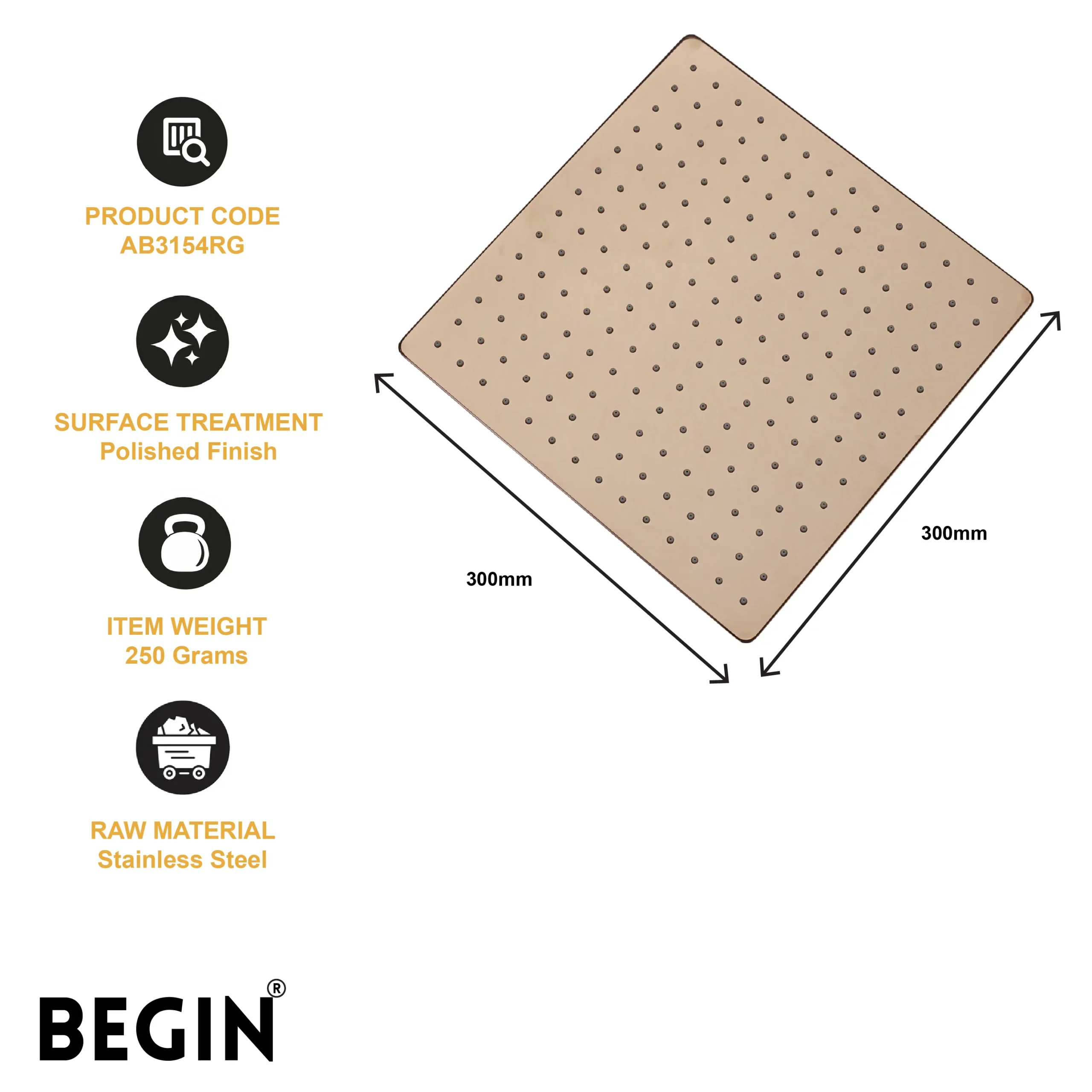 The BEGIN Master Square 12×12 Gold Glossy Shower AB3154GG is designed to bring luxury and elegance to modern bathrooms. Its large 12×12-inch square design provides wide water coverage, delivering a relaxing rainfall shower experience while enhancing the aesthetic appeal of the space.