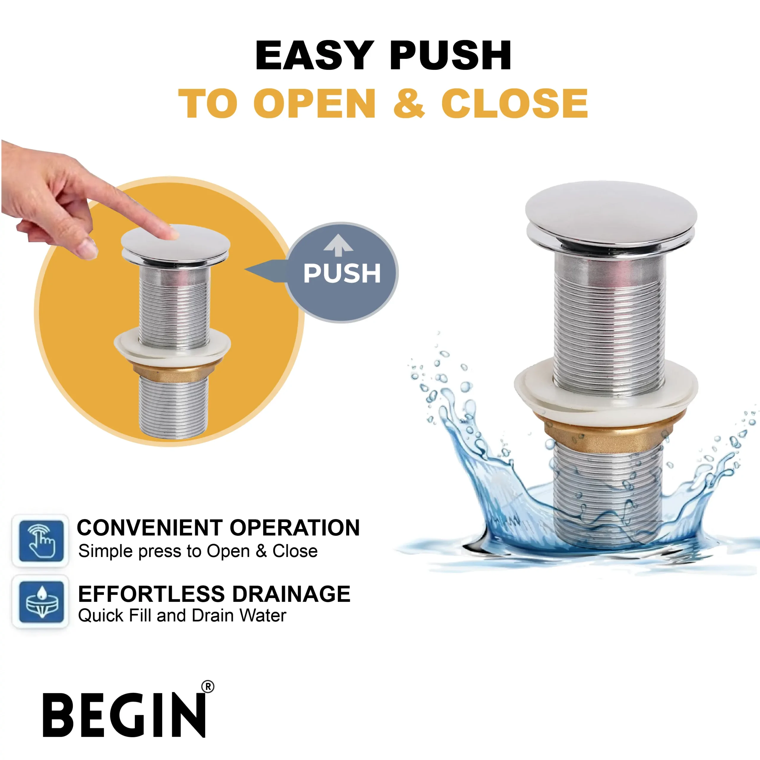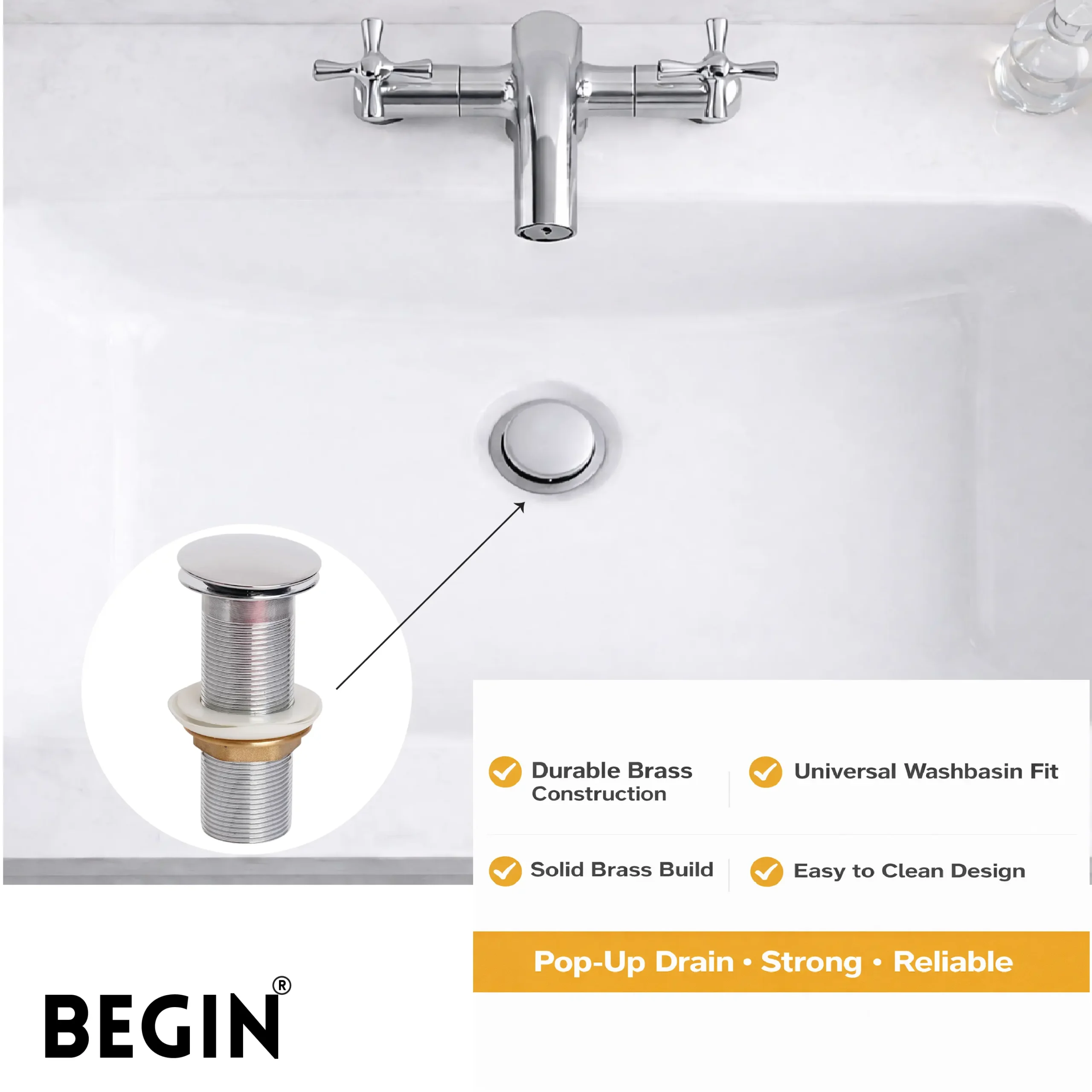 The BEGIN Pop Up 5″ Brass Waste Coupling AA0071 is designed to provide efficient and convenient drainage for wash basins. Its pop-up mechanism allows users to easily open and close the drain with a simple press, offering better control over water flow while keeping the basin clean and functional.
