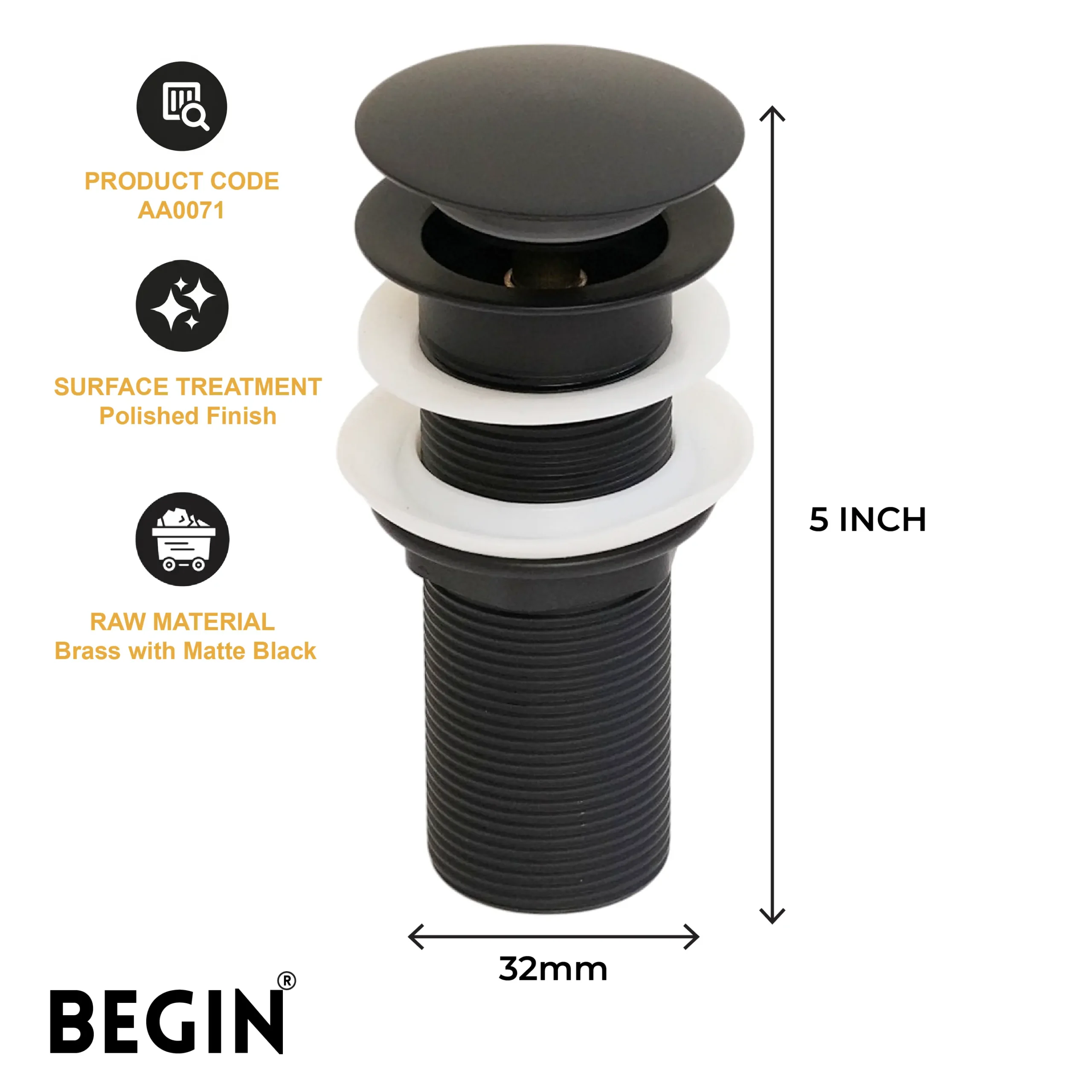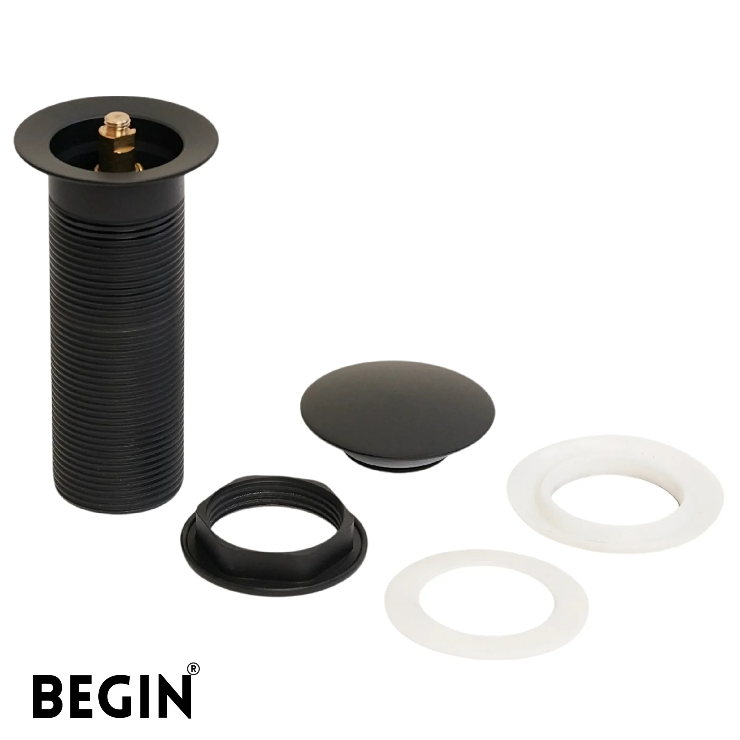The BEGIN Pop Up 5″ Brass Waste Coupling Matte Black AA0071MB is designed to provide smooth and convenient drainage for modern wash basins. Its push-pop mechanism allows users to easily open and close the drain with a simple press, ensuring better control of water flow while maintaining a clean and functional basin area.