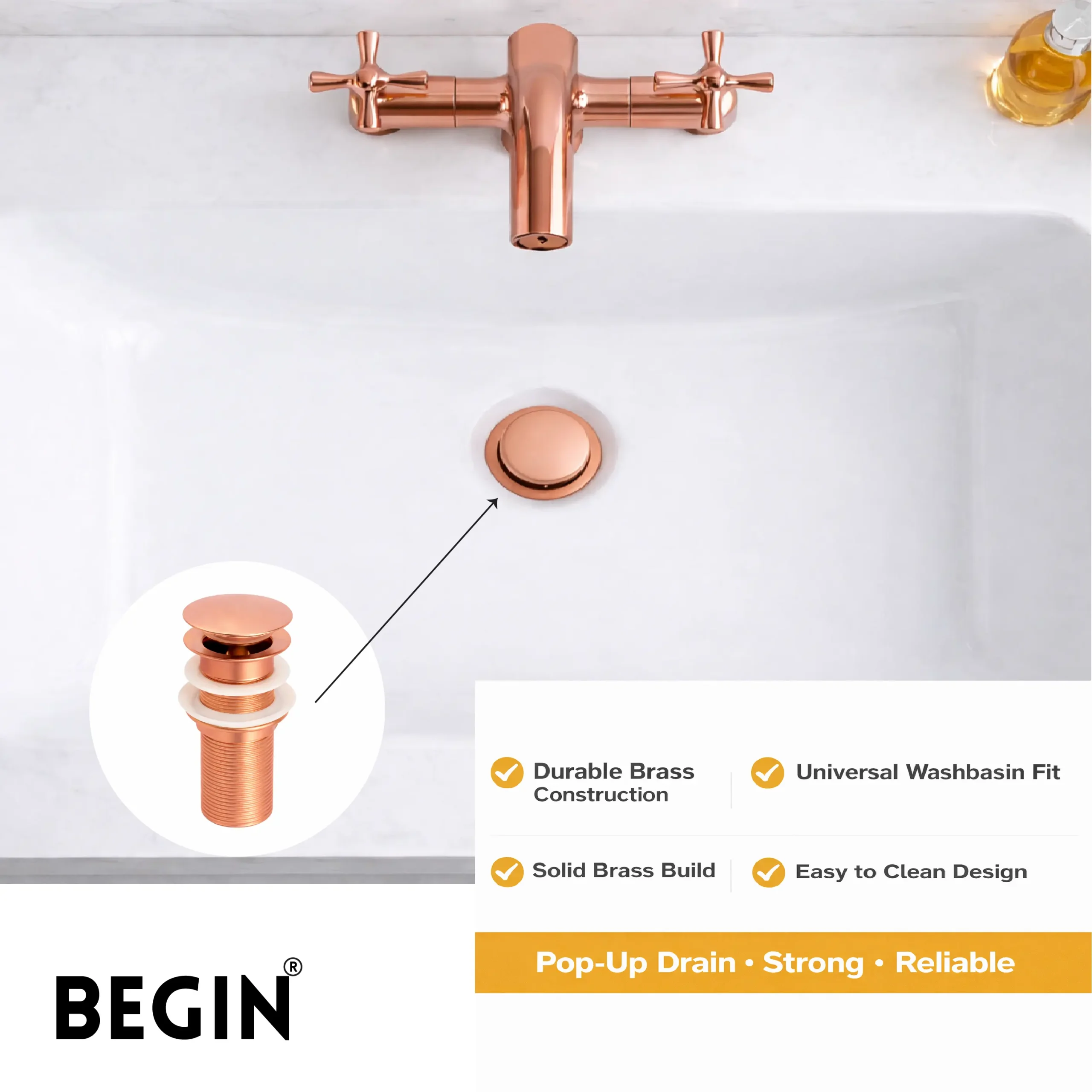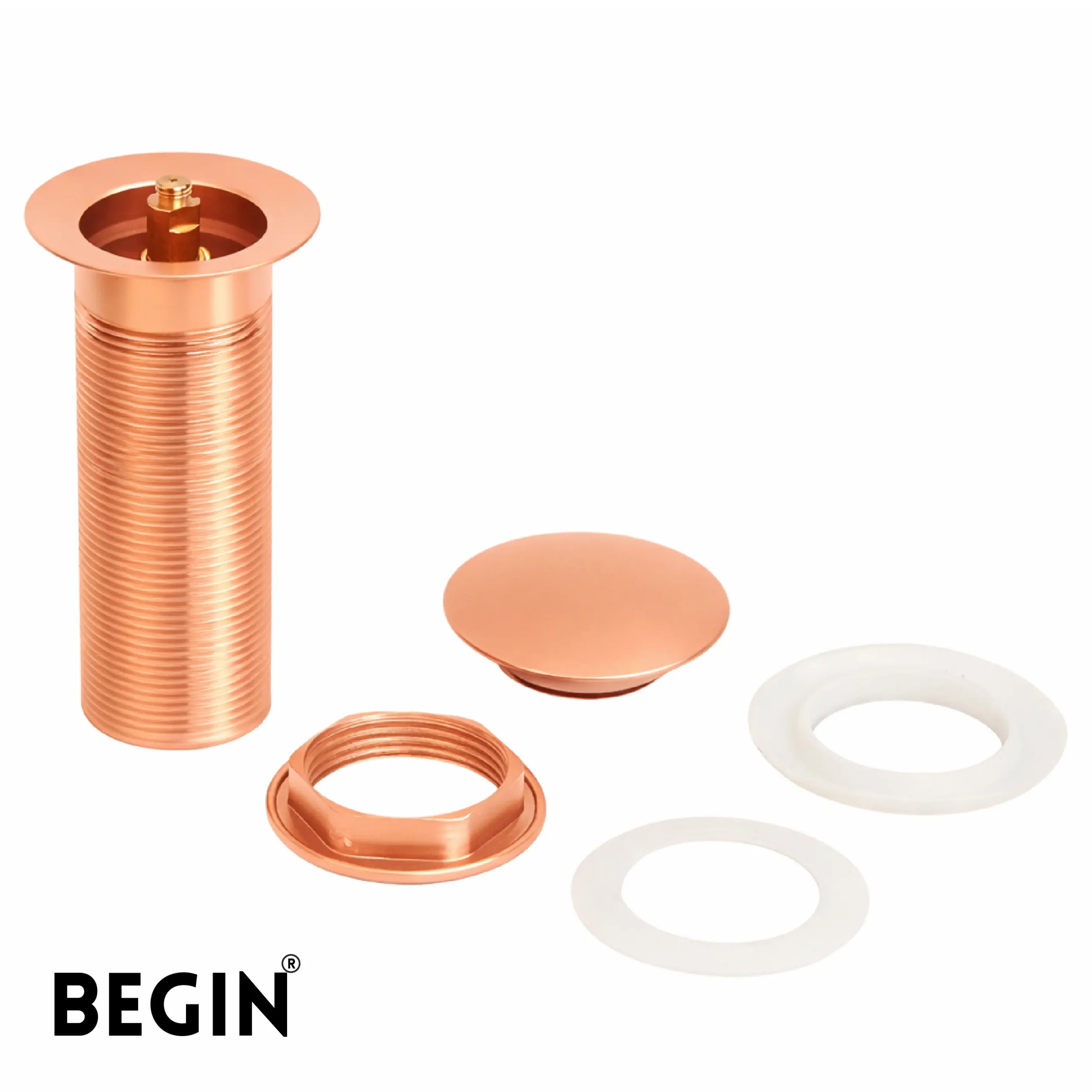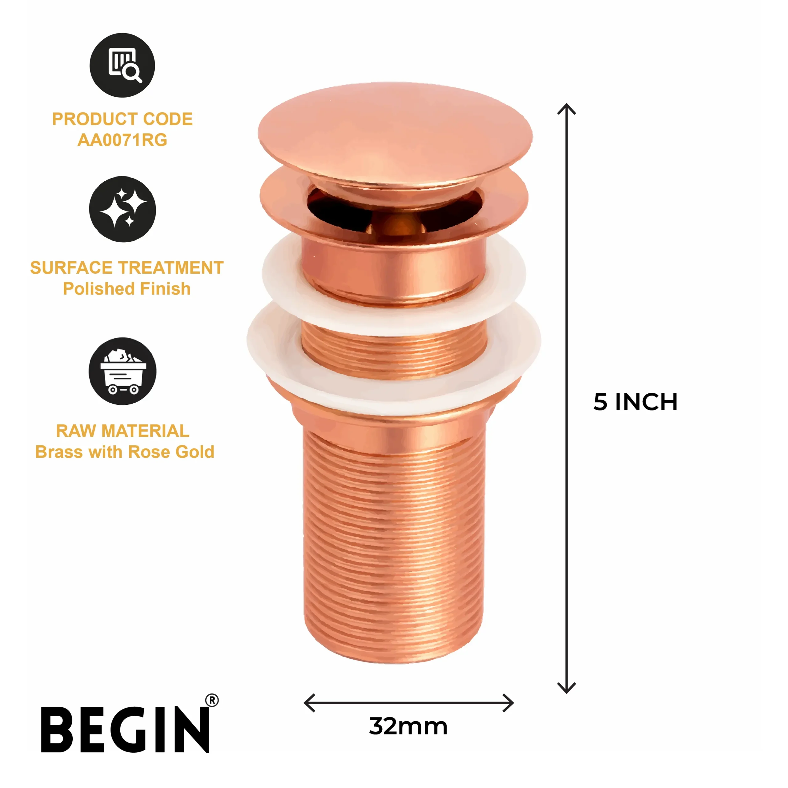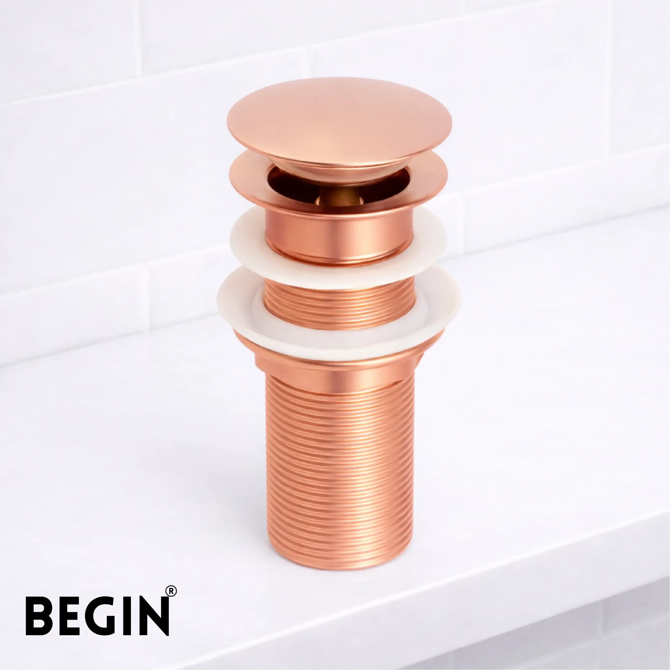 The BEGIN Pop Up 5″ Brass Waste Coupling Rose Gold AA0071RG is designed to provide smooth and convenient drainage for modern wash basins. Its push-pop mechanism allows users to easily open and close the drain with a simple press, ensuring better control of water flow while maintaining a clean and functional basin area.