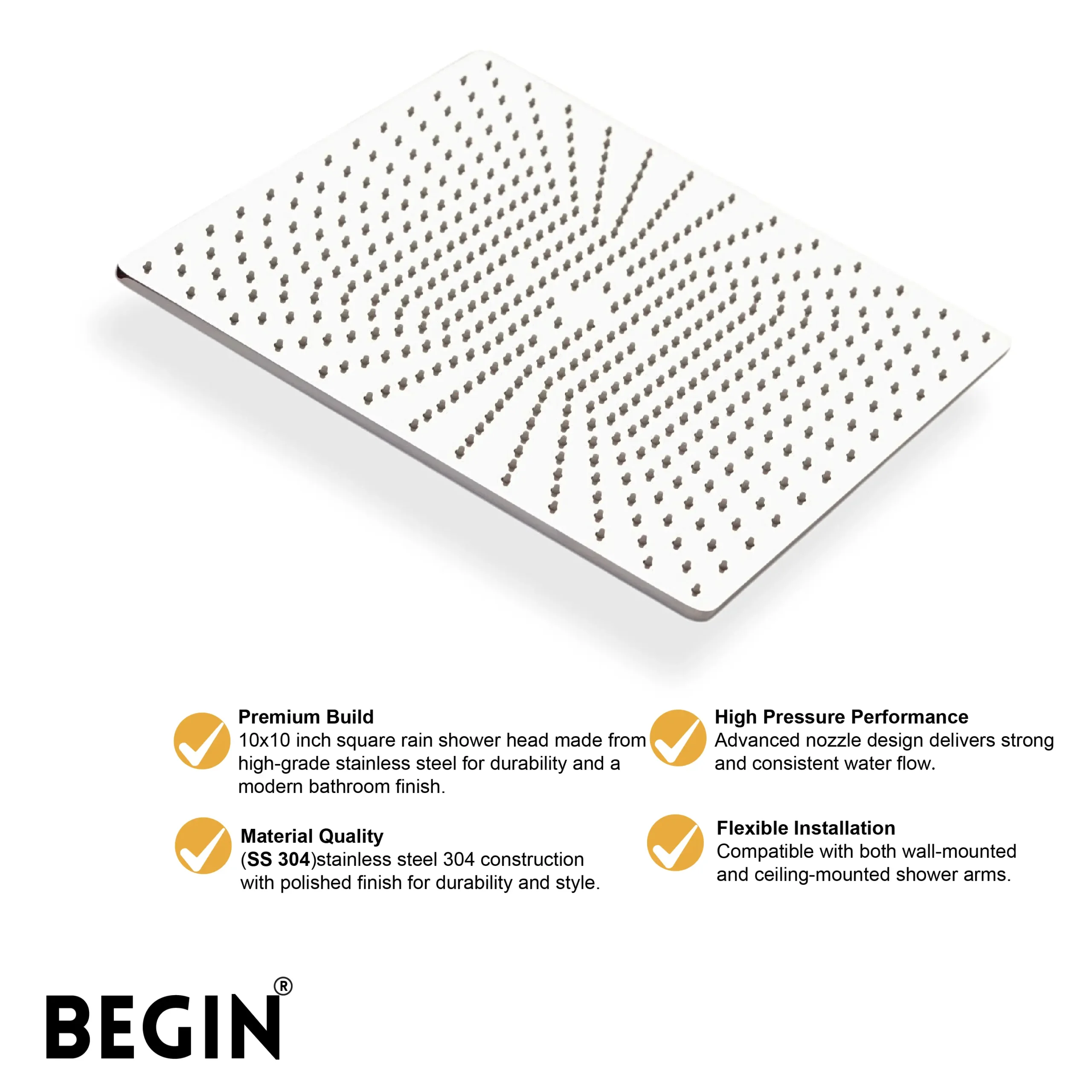 The BEGIN Soft 10×10 Inch Square Overhead Shower Head AB3173 is designed to provide a relaxing rainfall-style shower experience. Its large square surface ensures wider water coverage, making every shower comfortable and refreshing.